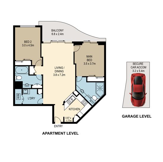 The floor plan of the apartment has the two generously sized bedroom split by the open plan living and dining area. The bedrooms offer large built-in wardrobes and the main bedroom includes a large ensuite bathroom and access to the balcony.